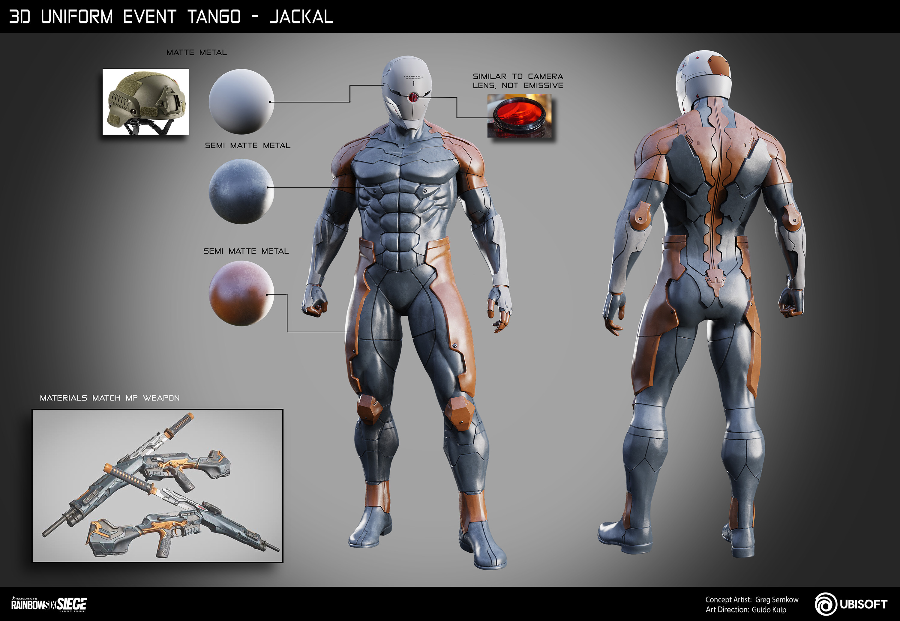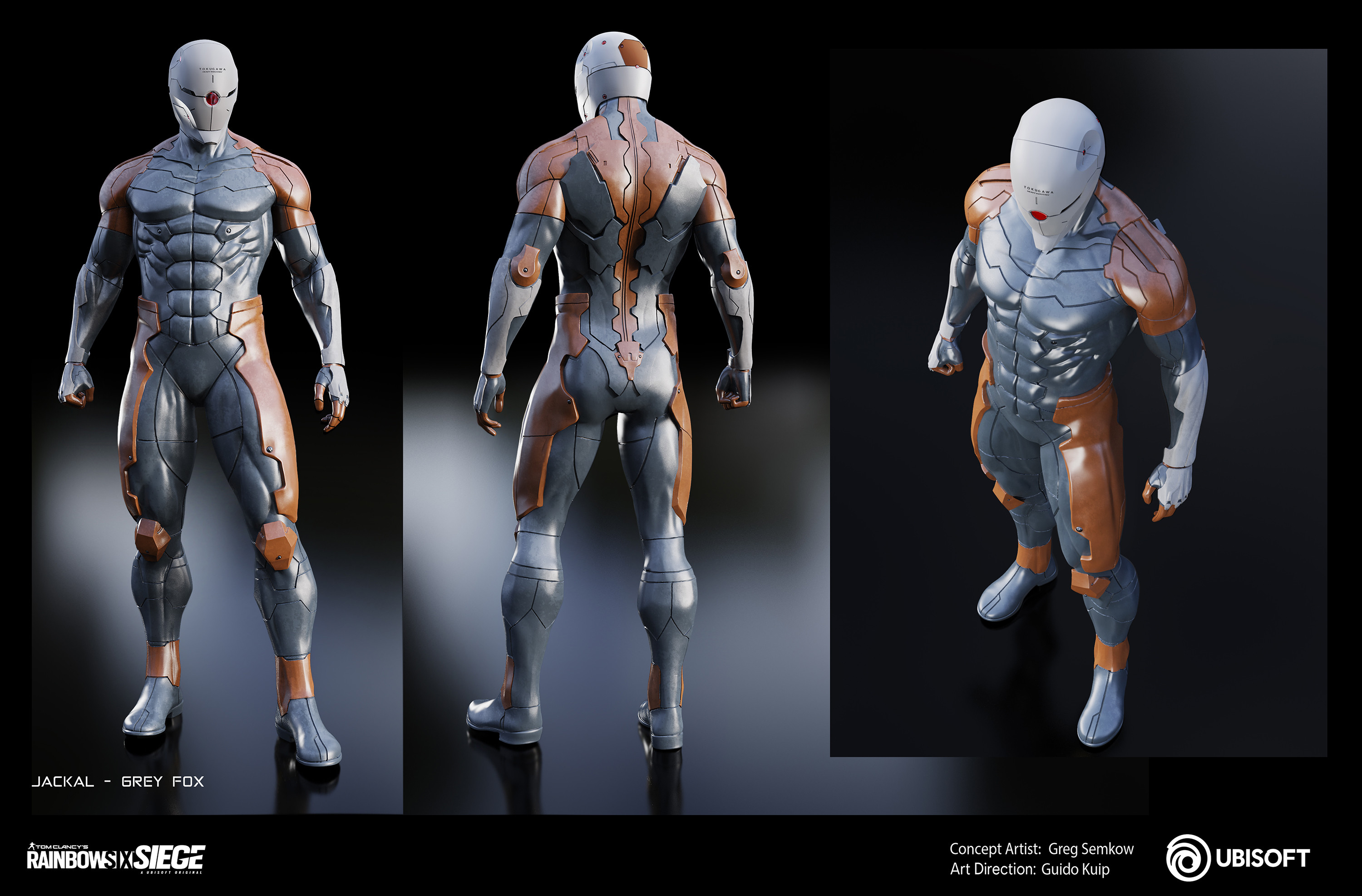 My Grey Fox design for the Rainbow Six Siege / Metal Gear Solid collaboration. Final designs, callouts, head gear turnaround, material callouts, and initial sketches.